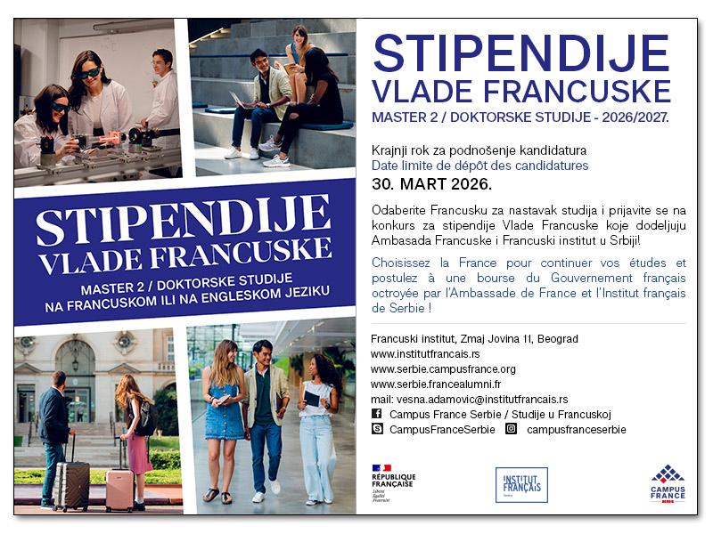 Француски институт и Амбасада Француске у Србији расписали су конкурс за стипендије Владе Француске за академску 2026/2027. годину, намењене кандидатима заинтересованим за мастер 2 и докторске студије у Француској.